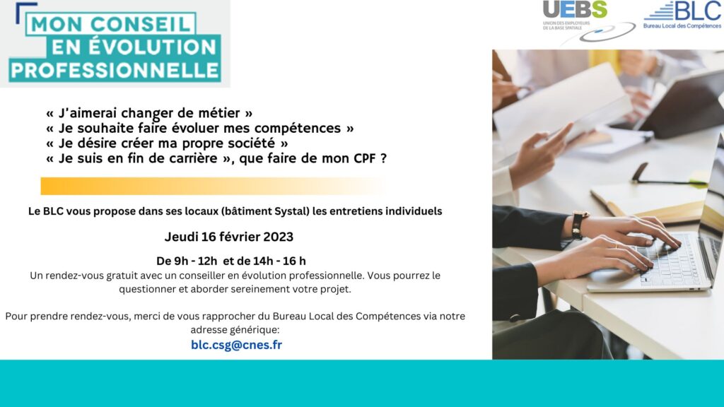 Le Bureau Local des Compétences (BLC) propose à tout salarié désirant faire un point sur son évolution professionnelle, un entretien individuel le jeudi 16 février 2023 à partir de 9 h.