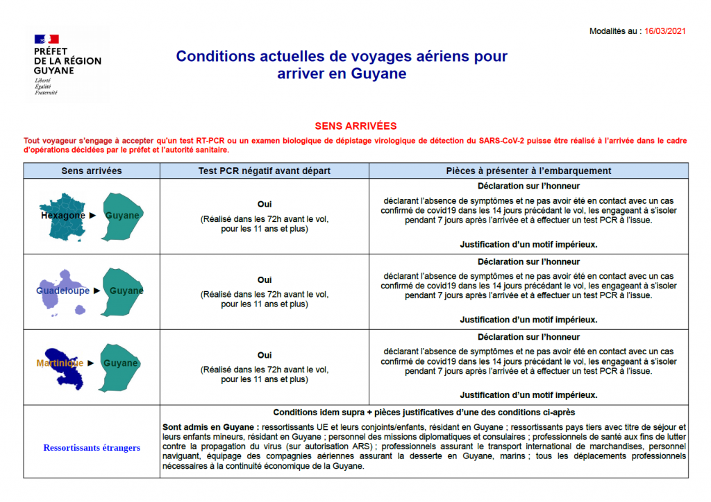 Conditions actuelles de voyages aériens pour la Guyane au 16/03/21