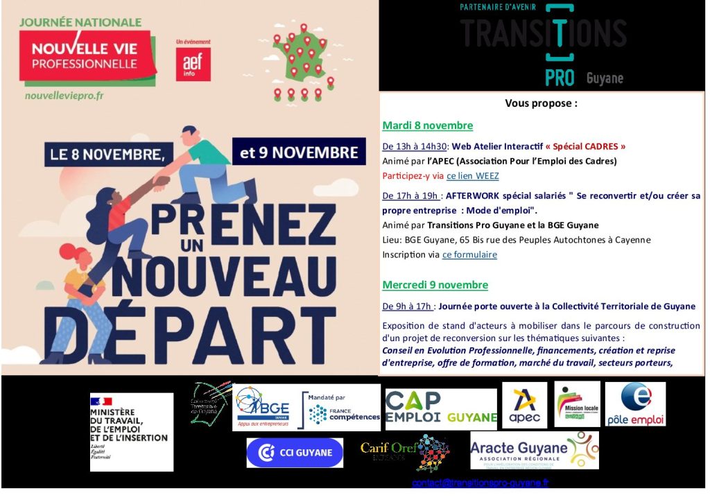À vos agendas ! Transitions Pro Guyane participe à la 2e édition des Journées nationales de la transition professionnelle, qui se déroulera du 8 au 9 novembre 2022. Au programme : atelier web interactif pour les cadres, afterwork spécial « salariés » et journée portes ouvertes à la collectivité territoriale de Guyane. Pour assister à l’atelier web animé par l’APEC, connectez-vous simplement […]